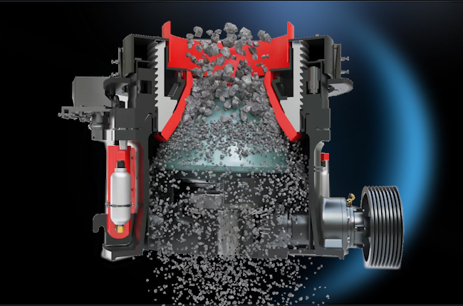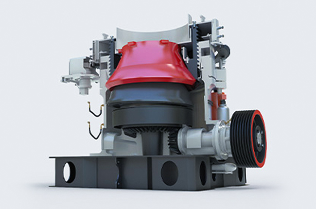在工作時(shí)通過電動(dòng)機(jī)的旋轉(zhuǎn)帶動(dòng)帶輪或聯(lián)軸器、傳動(dòng)軸和圓錐部在軸心線下使偏心軸做周期性旋擺運(yùn)動(dòng)。在物料從料口進(jìn)入破碎腔后因受到偏心軸和軋臼壁的相互沖擊擠壓、研磨、揉搓從而產(chǎn)生破碎的作用。液壓保險(xiǎn)系統(tǒng)能在機(jī)器發(fā)生過鐵故障或者悶車現(xiàn)象時(shí)通過液壓將支撐套和定錐部排除出故障物,在起到很好的保險(xiǎn)作用的同時(shí)大大的降低了維修率及提高生產(chǎn)效率。