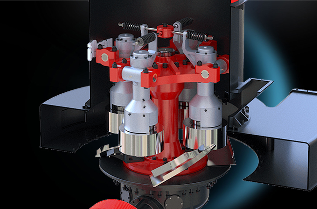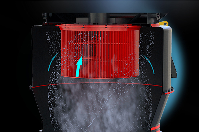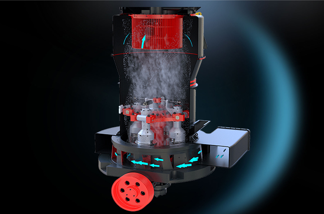 該機(jī)結(jié)構(gòu)主要由主機(jī)、分析器、風(fēng)機(jī)、成品旋風(fēng)分離器、微粉旋風(fēng)分離器及風(fēng)管組成。其中,主機(jī)由機(jī)架、進(jìn)風(fēng)蝸殼、鏟刀、磨輥、磨環(huán)、罩殼組成。雷蒙機(jī)工作時(shí),將需要粉碎的物料從機(jī)罩殼側(cè)面的進(jìn)料斗加入機(jī)內(nèi),依靠懸掛在主機(jī)梅花架上的磨輥裝置,繞著垂直軸線公轉(zhuǎn),同時(shí)本身自轉(zhuǎn),由于旋轉(zhuǎn)時(shí)離心力的作用,磨輥向外擺動,緊壓于磨環(huán),使鏟刀鏟起物料送到磨輥與磨環(huán)之間,因磨輥的滾動碾壓而達(dá)到粉碎物料的目的。